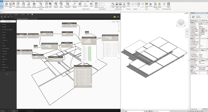 Pracując w trzecim wymiarze na etapie koncepcyjnym i wspomagając się dodatkowymi elementami, takimi jak chmura punktów, unikamy niedomówień projektowych na etapie wykonywania dokumentacji oraz nerwowej atmosfery w fazie wykonawczej. Upraszcza to proces analizy projektowanego obiektu, co w konsekwencji prowadzi do szybszego podejmowania decyzji projektowych i skraca czas opracowania dokumentacji. Kolejnym udogodnieniem pojawiającym się wraz ze wzrostem świadomości w użyciu narzędzi jest możliwość zautomatyzowania pewnych powtarzalnych procesów. Bardzo modne w tej chwili staje się projektowanie automatyczne, tzw. projektowanie generatywne. Oczywiście jest to modne medialnie i wykorzystywane przez duże pracownie projektowe. Przy użyciu oprogramowania Revit otrzymujemy oprogramowanie opensource Dynamo. Wykorzystanie tego „silnika” jest skomplikowane, ale daje nieograniczone możliwości rozszerzenia podstawowego Revita tak dalece, iż nie można o nim nie wspomnieć w aspekcie użycia go do prostej automatyzacji powtarzalnych czynności projektowych. Na swoim przykładzie mogę napisać, że jedną z nich, którą bardzo często wykorzystuję, jest zakładanie – modelowanie posadzek w pomieszczeniach. Czynność ta jest bardzo żmudna i zabiera sporo czasu, jednak dzięki odpowiednio zaprogramowanemu skryptowi proces ten został skrócony z jednego dnia (zależnie od obiektu) do paru minut.
