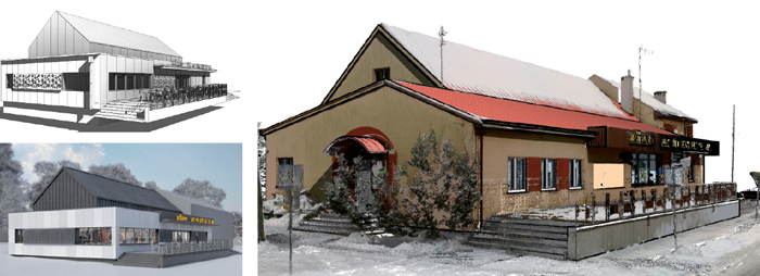 Rys. 2. Skan I model budynku kina. Obróbka chmury punktów musi odbywać się małymi elementami. Powinno się ustawić dużo widoków i przekrojów z odpowiednio zawężoną widocznością. Unikniemy nawarstwienia punktów (skan firmy Limbus Białystok)