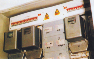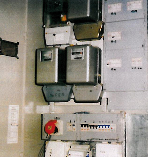 Fot. 4 Rozdzielnica licznikowa niezgodna z normami i przepisami, wyłącznik główny i wyłączniki administracyjne razem z licznikami