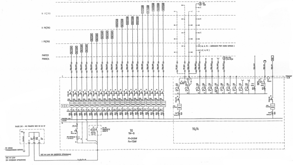 Rys. 1 Schemat rozdzielnicy głównej RG/A z tablicą administracyjną TA oraz czterema rozdzielnicami piętrowymi wg [1]