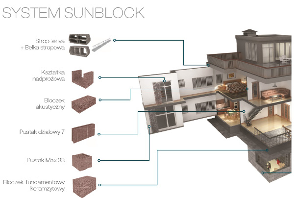 System Sun Block to rozwiązanie przeznaczone do budowy energooszczędnych i ekologicznych domów z elementów keramzytowych, z powodzeniem stosowane na rynku Europy Zachodniej i w Skandynawii.