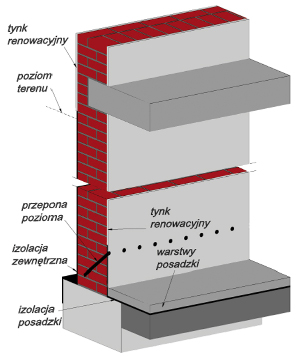 Jeśli odtworzenie pionowej izolacji od zewnątrz nie jest możliwe lub jest ekonomicznie nieuzasadnione, przeprowadza się zabiegi odcinające wilgoć od wewnętrznej strony budynku. W takim wypadku bariera przeciwwilgociowa uzyskana dzięki iniekcji odcina dopływ wilgoci z elementów, które z racji utrudnionego dostępu nie mogą być odizolowane od źródła zawilgocenia. Schemat takiego rozwiązania przedstawiono na rys. 4.