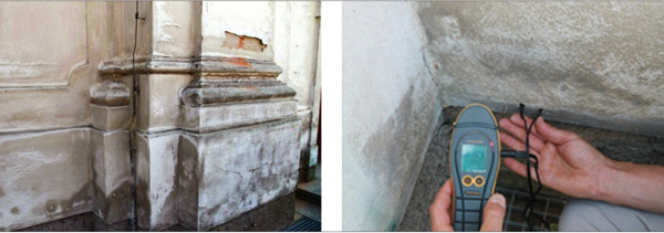 Roztwory soli mogą przedostawać się z zewnątrz do murów różnymi drogami, najczęściej przez uszkodzony dach, uszkodzoną instalację odprowadzającą wody opadowe, kondensację (na powierzchni wewnętrznej i zewnętrznej ścian), zacinający deszcz, absorpcję wilgoci z powietrza przez zawarte w murze sole o higroskopijnych właściwościach oraz przez podłoże gruntowe [2]. W tym ostatnim przypadku transport wilgoci odbywa się przez podciąganie kapilarne w systemie mikroporów istniejących w materiałach mineralnych. Sytuacja taka wystąpi wówczas, gdy zostanie uszkodzona izolacja zabezpieczająca mury od spodu. Przedostająca się tą drogą wilgoć może powodować zniszczenia na znacznych wysokościach (fot. 1).
