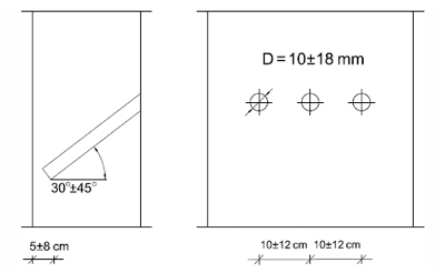 Rozmieszczenie otworów iniekcyjnych zależy od wilgotności ściany i warunków gruntowych panujących na zewnątrz restaurowanego budynku, rozstaw otworów zaś – od chłonności muru (zwłaszcza zaprawy). Otwory wykonuje się w jednym, dwóch lub w wielu rzędach. Nie wierci się ich w strefie występowania wody pod ciśnieniem. Prace ogranicza się do przestrzeni, w której występuje wilgoć bezciśnieniowa, tj. do obszaru cokołowego (powyżej poziomu otaczającego terenu) oraz w przypadku ścian piwnic powyżej maksymalnego poziomu występowania wody ciśnieniowej. Obowiązuje główna zasada, że im mniejszy odstęp między otworami, tym większa skuteczność zastosowanego środka. W praktyce dla przepon w murach o jednorodnej strukturze wystarcza umiejscowienie otworów w jednym rzędzie w odległości 10–12 cm i na długość mniejszą od grubości murów o ok. 5–7 cm (rys. 1). Do takich otworów wprowadza się płyn iniekcyjny najczęściej metodą ciśnieniową. W przeszłości stosowano też grawitacyjne metody wprowadzania iniektu.