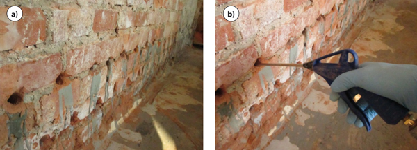 Fot. 3 a) ściana z wywierconymi otworami, b) przedmuchanie sprężonym powietrzem