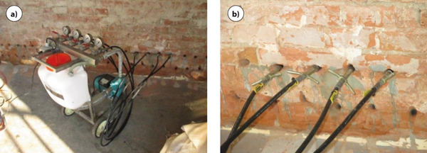 Jako iniekty stosuje się głównie środki na bazie krzemianów alkalicznych lub polisiliksanów.Preparaty takie są dostępne w postaci wodnych roztworów. Wprowadza się je za pomocą pomp do wykonywania iniekcji (rys. 5). Ile iniektu trzeba użyć, określa producent, zależy to od przekroju poprzecznego muru. Najczęściej na jeden metr kwadratowy przekroju muru trzeba zaaplikować ok. 15 kg iniektu. Właściwą ilość preparatu, jaką wprowadza się do poszczególnych otworów, ustala się na podstawie czasu iniekcji przy stałym ciśnieniu wynoszącym od 3 do 4 barów. Czas iniekcji ustala się na reprezentatywnym odcinku muru – jest to czas potrzebny do wprowadzenia wcześniej odważonej ilości preparatu iniekcyjnego.