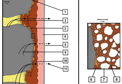 Rys. 2 Budowa i sposób funkcjonowania systemu tynków renowacyjnych: 1 – element konstrukcyjny muru, 2 – zaprawa murarska, 3 – obrzutka, 4 – tynk renowacyjny, 5 – powłoka ochronno-dekoracyjna, 6 – spoiwo hydrauliczne (cement), 7 – pory wypełnione powietrzem, 8 – kruszywo (piasek kwarcowy), 9 – kierunek przepływu kapilarnego wody zawierającej rozpuszczone sole, 10 – miejsca krystalizacji, 11 – dyfuzja w postaci pary wodnej