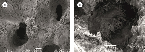 Fot. 5 Zdjęcia wykonane elektronowym mikroskopem skaningowym: a) struktura utwardzonego tynku renowacyjnego, b) por w tynku renowacyjnym zawierającym skrystalizowane sole