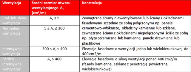 Wymagany opór dla przepływu powietrza w odniesieniu do warstwy izolacji zależy z jednej strony od prędkości przepływu powietrza, a z drugiej – od przepuszczalności powietrznej samego materiału. Ściana może być zaprojektowana bez wentylacji, ze słabą wentylacją lub z mniej lub bardziej wysoką wentylacją. Tabela 1. przedstawia różne rodzaje systemów ścian izolacyjnych w zależności od wielkości otworów wentylacyjnych. Parametr „Av” symbolizuje wielkość otworu wentylacyjnego w dolnej części na jeden metr kwadratowy elewacji.