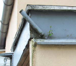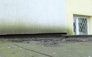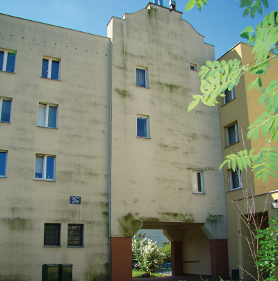 Fot. 4. Naloty glonów na daszku nad wejściem do klatki schodowej i na przyległej ścianie zawilgacanej wodą odpryskującą od daszku