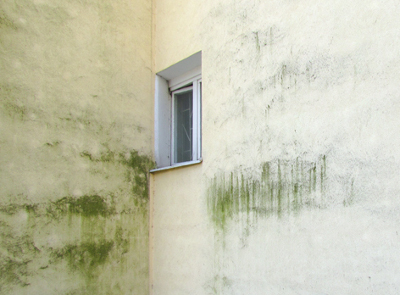 Fot. 3. Glony rosnące na ścianie zawilgoconej na skutek uszkodzonych obróbek blacharskich