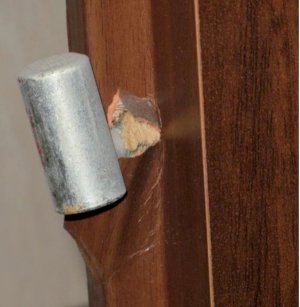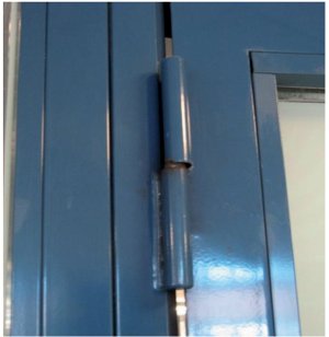 Fot. 1 Wyrwanie zawiasów drzwi wskutek nieodpowiedniej wytrzymałości na obciążenie pionowe