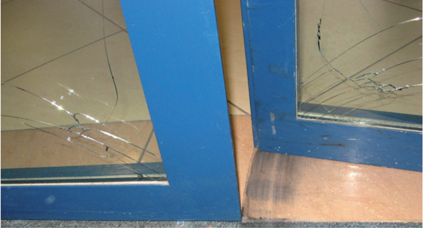 Fot. 2 Uszkodzenie przeszklenia drzwi; wskutek osiadania narożniki drzwi ocierały o posadzkę, co wywoływało powstanie obciążenia skręcającego przekraczającego wartości dopuszczalne