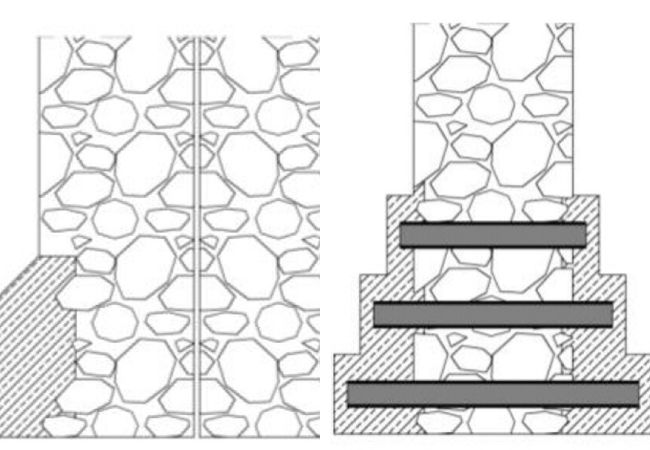 Rys. 1. Poszerzenie jednostronne fundamentu kamiennego (opracowanie własne). Rys. 2. Poszerzenie obustronne, schodkowe fundamentu kamiennego (opracowanie własne)