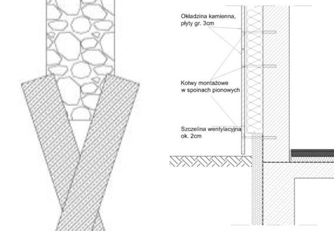 Kamienne okładziny na elewacjach budynków dodają prestiżu oraz powagi. Kojarzą się z czymś trwałym i ponadczasowym. Można podzielić je na dwa typy: wentylowane oraz niewentylowane. Podział ten znacząco determinuje technologię montażu i wykonania poszczególnych elementów. W elewacjach wentylowanych (rys. 4) są używane płyty kamienne o grubości min. 3 cm i znaczących wymiarów. Ich montaż odbywa się za pośrednictwem stalowych kotew umieszczanych w sposób niewidoczny w spoinach pionowych między płytami. Zaletą tego rozwiązania jest możliwość demontażu pojedynczych elementów celem np. prowadzenia instalacji w pustce powietrznej, oraz wymiany elementów zniszczonych czy uszkodzonych. Elewacje wentylowane stosuje się przede wszystkim w budynkach biurowych oraz użyteczności publicznej. Zastosowanie tej technologii w domach jednorodzinnych jest ograniczone, gdyż ten sposób montażu sprzyja przede wszystkim dużym powierzchniom, o licznych powtarzalnych elementach. Nie jest natomiast przystosowany do wielu nieregularnych docięć, występujących w przypadku małych obiektów.