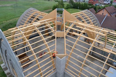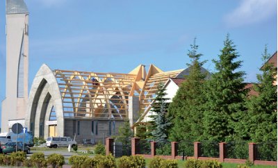 Fot. 1 Konstrukcja z drewna klejonego. Budynek kościoła parafii im. Stefana W. Frelichowskiego w Toruniu (źródło: archiwum firmy WMS, www.wmsbudownictwo.pl)