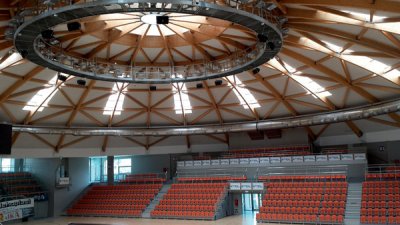 Ostatnią prezentowaną konstrukcją jest dach hali sportowej będącej częścią kompleksu sportowego w Kwidzynie (fot. 7). To konstrukcja z ok. 330 m3 dźwigarów drewnianych klejonych warstwowo, montowanych na placu budowy w okresie zimowym przez blisko 2,5 miesiąca. Główny szkielet kopuły o średnicy 50 m tworzą dźwigary łukowe promieniowe oparte przegubowo na pierścieniu żelbetowym i złączone za pomocą stalowego zwornika. Dźwigary są wykonane z drewna w klasie GL28h o szerokości 200 cm, wysokości zmiennej na długości od 100 cm do 80 cm przy zworniku oraz promieniu wewnętrznym 40 m i długości ok. 25 m. Pomiędzy dźwigarami łukowymi głównymi znajdują się płatwie z drewna klejonego rozmieszczone w rozstawie ok. 134 cm. Zgodnie z obliczeniami statycznymi płatwie mogłyby mieć przekroje od 180/240 do 120/240 mm, niemniej ze względu na konieczność zastosowania wytrzymałości ogniowej R30 na podstawie klasyfikacji ogniowej producenta przyjęto wszystkie płatwie nie mniejsze niż 160/240 mm.