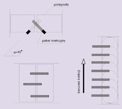 Typowy rozstaw otworów dla przepon kurtynowych to siatka 50×50 cm, z jednym otworem dodatkowym w środku każdego kwadratu. Pamiętać należy, że im grubsza przegroda, tym rozstaw otworów powinien być mniejszy, przy jednocześnie większej średnicy samych otworów. Jeżeli pakery nie są mocowane w zewnętrznej strefie muru, zużycie iniektu wzrasta wraz z grubością muru. Żel wnika bowiem w istniejące pęknięcia i rysy oraz pory muru, co powoduje jego dodatkowe uszczelnienie strukturalne, jednak jednocześnie wzrasta zużycie materiału. Podobny wpływ na zużycie żelu ma rodzaj gruntu otaczającego budynek. Grunty spoiste pozwalają na penetrację iniektu tylko na płaszczyźnie styku ściana–otaczający grunt. Obecność gruntów niespoistych powoduje, że część materiału jest wiązana przez grunt i jego zużycie wzrasta. Należy się ponadto liczyć z lokalnymi pustkami i ubytkami występującymi przy powierzchni muru, co także powoduje zwiększone zużycie materiału. Dlatego też iniekcję w grunt rozpoczyna się od najniższego rzędu otworów i prowadzi się ją do momentu zauważenia wycieku żelu przez sąsiednie otwory lub uzyskania zużycia adekwatnego do uzyskanego we wcześniejszych próbnych iniekcjach. Po zakończeniu iniekcji należy usunąć końcówki iniekcyjne, a otwory zasklepić systemową zaprawą.