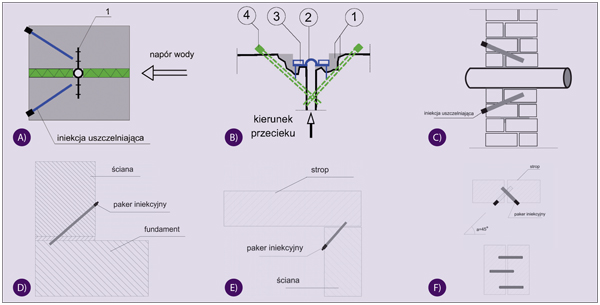 D–F) Przykładowy schemat uszczelnienia przeciekających przerw technologicznych i rys