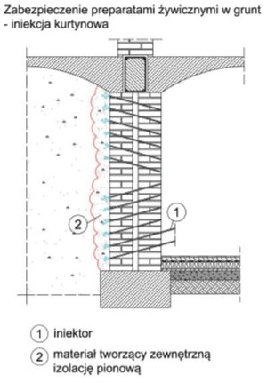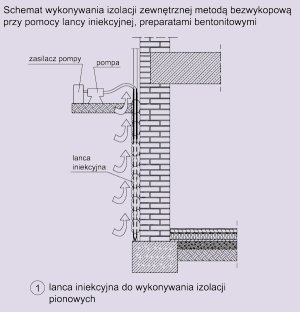 – w budynkach przyległych do uczęszczanych pasaży handlowych, ciągów komunikacyjnych itp., gdzie wykonanie w chodniku wykopu w celu odtworzenia zewnętrznej izolacji pionowej z różnych przyczyn nie jest możliwe;