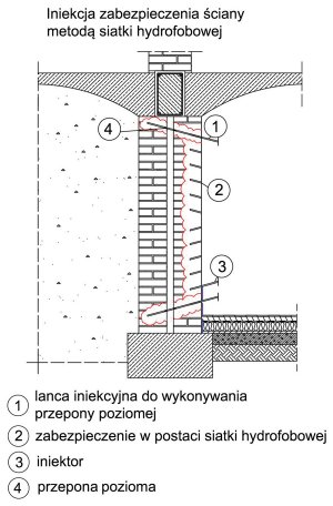 Iniekcję wykonuje się zazwyczaj przy odwiertach poziomych, choć możliwe jest także wykonanie ich przy kącie nachylenia 45o. Rozpoczynać ją należy od najniższego rzędu otworów. Zalecana jest dwustopniowa kontrola procesu – zużycie iniektu na otwór (wysycenie obszaru przy otworze) oraz pokazanie się żelu w sąsiednich otworach. Rzeczywiste zużycie materiału zależy od faktycznego stanu muru, jego zawilgocenia, obecności rys i pustek. Dlatego też zalecane jest wykonanie wstępnych wierceń i iniekcji. Pozwala to na określenie rzeczywistego zużycia i oszacowanie czasu trwania wysycania muru. Jest to szczególnie istotne w przypadku wykonywania iniekcji pompą jednokomponentową, proces żelowania rozpoczyna się już w pompie iniekcyjnej, po zmieszaniu składników preparatu. Przez pewien czas od wymieszania składników preparat nie zmienia swoich właściwości i w tym czasie musi zostać całkowicie wprowadzony w strukturę muru. Faza żelowania musi przebiegać już w murze. Po zakończeniu iniekcji należy usunąć pakery, a otwory zasklepić systemową zaprawą. Zalecane jest stosowanie bezskurczowych lub pęczniejących szybkowiążących zapraw naprawczych.