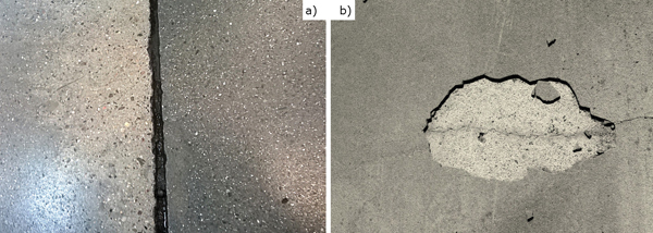 Fot. 1 Przykład nadmiernego ścierania (a) i rozwarstwienia (b) w podłodze przemysłowej