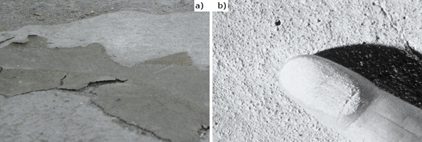 Fot. 4 Przykłady występowania uszkodzeń posadek przemysłowych: a) łuszczenie, b) pylenie
