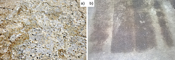 Fot. 5 Przykłady występowania uszkodzeń wywołanych: a) korozją chemiczną, b) zmianą koloru posadzki