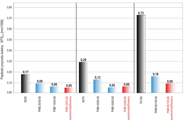 Na rysunkach przedstawiono porównanie odporności na koleinowanie (rys. 1) oraz pękanie niskotemperaturowe (rys. 2) mieszanek mineralno-asfaltowych zawierających asfalty drogowe, modyfikowane i wysokomodyfikowane. Badania wykonano w ramach prac badawczych prowadzonych przez Orlen Asfalt w latach 2010–2015.