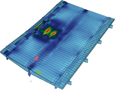 Wiele przykładów zagranicznych pokazuje bardziej lub mniej zaawansowane podejścia analityczne w tym zakresie. Istotą obliczeń jest określenie maksymalnych naprężeń panujących w warstwach nawierzchni i na styku z izolacją. W ramach analizy wykonywane są obliczenia na modelu reprezentatywnego wycinka płyty pomostu z przyjętymi warunkami brzegowymi wynikającymi ze struktury obiektu oraz elementami materiałowonieliniowymi nawierzchni (uwzględnienie reologii – model lepko-sprężysty Maxwella) i elementami izolacji. Obliczenia przeprowadzane są dla lokalnych obciążeń koła pojazdu, hamowania i przyspieszania oraz obciążeń zmian temperatury w czasie i gradientu temperatury. Wynikiem są siły i naprężenia w elementach nawierzchni oraz na połączeniach (zespolenie). Przykładowo pokazano modelowanie dla ortotropowej płyty pomostu mostu w Toruniu, gdzie w wyniku obliczeń zdefiniowano oczekiwaną wytrzymałość na rozwarstwienie MA i izolacji na poziomie 2,5 MPa. W podobny sposób postępowano w zagranicznym projekcie badawczym [9] w celu wyznaczenia wytrzymałości epoksydowej warstwy sczepnej dla nawierzchni na płycie ortotropowej i uzyskano podobne wyniki naprężeń. Dodatkowo wykazano zależność nośności połączenia (ścinanie) od temperatury i naprężeń normalnych w nawierzchni.