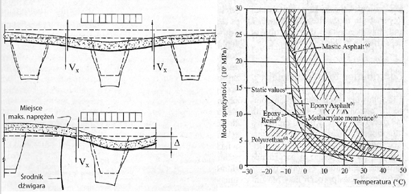 Płyta pomostu może być podłożem sztywnym w przypadku płyty betonowej lub podłożem o zmiennej sztywności w przypadku płyty ortotropowej (blacha i żebra), co stanowi różnicę w doborze rodzaju nawierzchni. Płyta pomostu doznaje zmiennych lokalnych i globalnych przemieszczeń na skutek obciążeń od pojazdów, temperatury i reologii. Toteż w nawierzchni powstają naprężenia, które nie występują w nawierzchni usytuowanej w korpusie drogowym. Jak wykazały liczne badania i obliczenia, np. [7, 10], naprężenia w warstwach nawierzchni na mostach są kilkakrotnie wyższe niż porównywalne w warstwach nawierzchni drogowej.