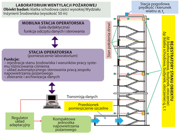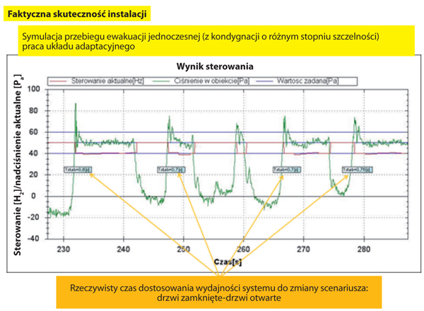 Badania weryfikujące rzeczywistą skuteczność systemu odbyły się na specjalnie w tym celu skonstruowanym stanowisku doświadczalnym na Wydziale Inżynierii Środowiska Politechniki Warszawskiej (rys. 2). Obiektem regulacji jest tu 11-kondygnacyjna klatka schodowa (o łącznej wysokości ponad 50 m) oraz szczelny przedsionek pożarowy. Celem testów było m.in. sprawdzenie odporności opracowanego w ramach programu badawczego układu sterowania na bardzo silne zakłócenia związane z realizacją nietypowych scenariuszy pożarowych. Eksperymenty były przeprowadzone np. w warunkach jednoczesnej ewakuacji (bardzo częste zmiany konfiguracji otwartych drzwi), przy celowym zakłócaniu stanu środowiska wewnętrznego (nietypowe rozszczelnianie przestrzeni chronionej), oraz w zmiennych warunkach środowiska zewnętrznego (szeroki gradient temperatury zewnętrznej). Wyniki testów przeprowadzonych w różnych warunkach wykazują dwie podstawowe, unikatowe właściwości systemów predykcyjnych. Po pierwsze, przy próbach odpowiadających charakterowi rzeczywistej ewakuacji (sposób niekontrolowany – ludzie np. opuszczają kondygnacje nie objęte pożarem, i konfiguracja drzwi otwartych przy ewakuacji jednoczesnej całego budynku) układ wykazywał bardzo krótkie czasy reakcji, czyli osiągnięcia wyjściowych parametrów nadciśnienia w przestrzeni chronionej po powrocie do realizacji scenariusza wszystkich drzwi zamkniętych (rys. 3).