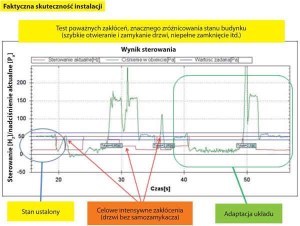 Druga, nawet cenniejsza właściwość algorytmu regulacji sterującej systemem napowietrzania pożarowego polega na jego bardzo wysokiej odporności na zakłócenia przy realizacji najbardziej nawet niekorzystnych scenariuszy zakłócających. Przez pojęcie niekorzystnych scenariuszy zakłócających można rozumieć tu np. częste i bardzo szybko następujące zmiany stanu obiektu regulacji: drzwi otwarte, drzwi zamknięte oraz najtrudniejszy przypadek – zmiana wydajności instalacji napowietrzającej z minimalnych wydajności rzędu kilkuset m3/h do kilkunastu tysięcy m3/h. Przypadek taki może dotyczyć napowietrzania pożarowego szczelnych przestrzeni, takich jak przedsionki pożarowe lub klatki schodowe w budynkach o znacznym stopniu szczelności, gdzie dla uzyskania wymaganego nadciśnienia wystarczy minimalny strumień powietrza zewnętrznego, natomiast otwarcie drzwi między przestrzenią chronioną i niechronioną nadciśnieniem musi powodować skokowy wzrost wydajności instalacji, aż do uzyskania wymaganej prędkości przepływu. W warunkach stanowiska badawczego dla napowietrzenia niewielkiej przestrzeni przedsionka pożarowego do wymaganego nadciśnienia 50 wydajność wynosiła ok. 800 m3/h (sterowanie wentylatora 10 Hz), a po otwarciu drzwi (o przekroju 1,8 m2) nastąpił wzrost wydajności do ok. 21 000 m3/h. Jednocześnie przeprowadzane było dodatkowe „męczenie” układu regulacji polegające na niepełnym zamykaniu drzwi oraz wielokrotnym ich otwieraniu oraz zamykaniu w krótkim przedziale czasowym (tzw. test wzbudzeniowy). We wszystkich przypadkach układ umiał znaleźć właściwy punkt pracy oraz nie wpadał w oscylację (co było normą przy podobnych testach dla prostszych algorytmów regulacyjnych).