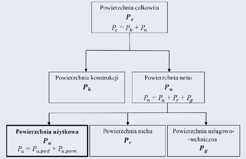 Zarówno w normie PN-B, jak i w normach PN-ISO występują, z pewnymi drobnymi różnicami, identyczne rodzaje wskaźników powierzchniowych (rodzajów powierzchni). Podstawową powierzchnią charakteryzującą cały budynek jest jego powierzchnia całkowita stanowiąca sumę powierzchni poszczególnych kondygnacji mierzonych po obrysie zewnętrznym ścian. Dalszy podział tej powierzchni i zależność między różnymi rodzajami powierzchni (w tym wydzielenie powierzchni użytkowej), wraz z ich symbolami, pokazano na rys. 1.