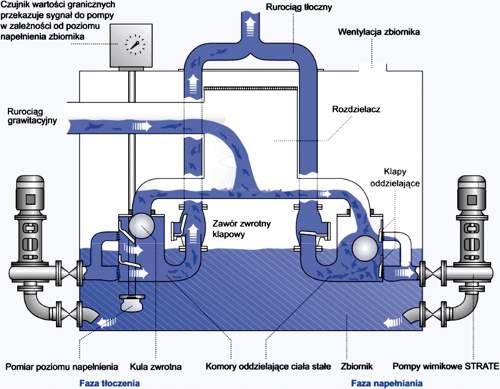 Ścieki wpływają do komór oddzielających ciała stałe od pomp. Zawarte w ściekach części stałe zatrzymywane są w komorze (separatora) za pomocą specjalnych systemów oddzielających. Ścieki pozbawione grubszych zanieczyszczeń wpływają do zbiornika. Po całkowitym napełnieniu zbiornika klapa zwrotna zamyka dopływ. Pompa, która sterowana jest w zależności od napełnienia zbiornika, włącza się i tłoczy podczyszczone ścieki przez komorę oddzielającą ciała stałe do rurociągu tłocznego. Oddzielone w komorze grubsze zanieczyszczenia zostają porwane wraz z podczyszczonymi ściekami i komora zostaje całkowicie wyczyszczona. Ścieki dopływają w trakcie pracy pompy przez drugą komorę i niepracującą pompę do zbiornika. Pompy pracują na zmianę. Wielkość zbiornika i liczba pomp oraz komór oddzielających zależą od ilości dopływających do przepompowni ścieków.