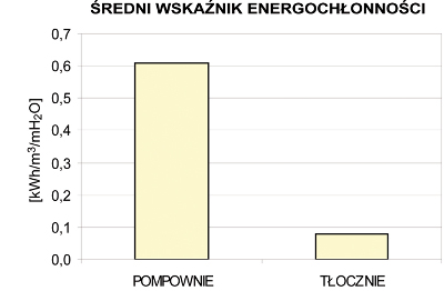 Dla tradycyjnych przepompowni ścieków średni jednostkowy wskaźnik zużycia energii potrzebnej do przepompowania metra sześciennego ścieków na wysokość metra H2O wyniósł 0,60 [kWh/m3/mH2O], natomiast dla pompowni ze wstępną separacją – tłoczni ścieków wskaźnik ten osiągnął wartość 0,08 [kWh/m3/mH2O] (jest to 7,5 razy więcej).