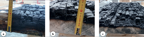 Fot. 9 Element stropowy po teście ogniowym. Grubość wyjściowa 10 cm, po 60 minutach działania pożaru widoczny ubytek materiału ~ 40 mm, co niejako potwierdza normową prędkość spalania na poziomie 0,7 mm/min. Test zakończony pomyślnie, wynik: REI60; drewno dzięki swoim parametrom doskonale izoluje wysoką temperaturę pożaru od pozostałych pomieszczeń i bez problemu można tworzyć z niego przegrody ogniowe, jak stropy i ściany o odporności REI30 oraz REI60
