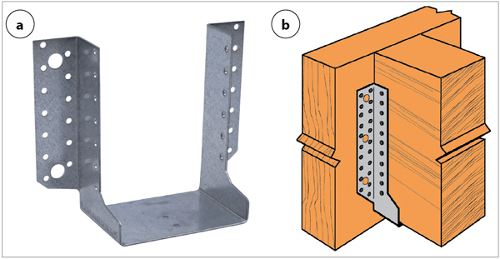 Pierwszą z możliwości jest zastosowanie ukrytych wieszaków belek. Ukryte wieszaki belki są to złącza, które tworzą połączenia niewidoczne dla użytkownika. Ich głównym zastosowaniem są połączenia, które ze względów architektonicznych czy estetycznych nie mogą być widoczne. Dodatkową ich zaletą jest fakt, że montując je wewnątrz elementu podwieszanego, tworzymy naturalną otulinę drewnianą. Odwołując się do sekcji 6 Eurokodu 5 część 1-2, można udowodnić odporność ogniową złącz tego typu.