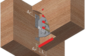 *dla połączeń z wielkością szczeliny między elementami ≤ 1 mm wartości dg2 mogą być zastąpione wartościami dg1, gdzie: t1 – otulina drewniana po obu stronach złącza, af1 – grubość drewnianego czopu, dg1 – grubość wklejanej wkładki, dg2 – szerokość drewnianej otuliny skrzydełek bocznych wieszaka dla szczeliny między elementami ≤ 3 mm.