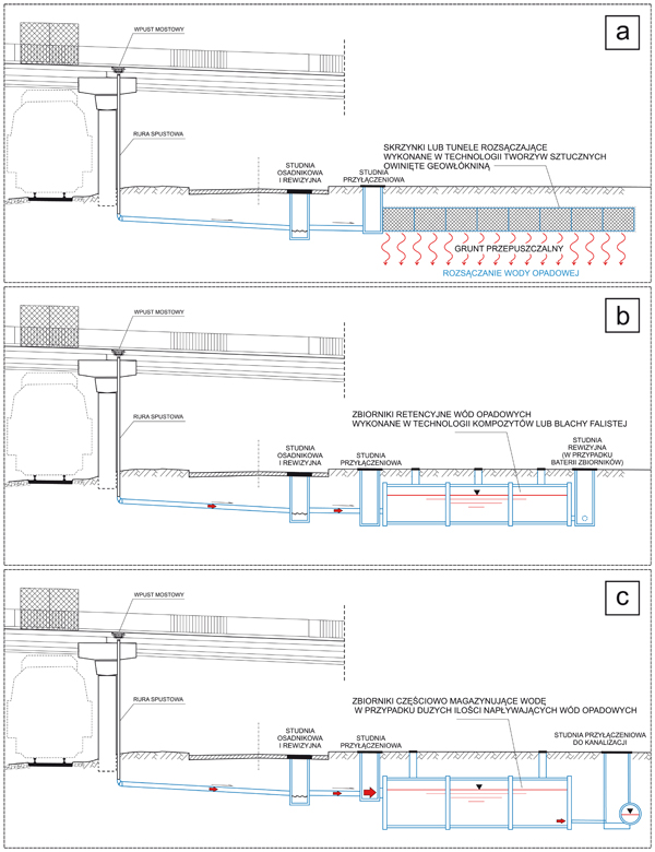 Rys. Sposoby odwodnienia wgłębnego obiektu mostowego: a) system skrzynek lub tuneli rozsączających, b) system retencji wody z wykorzystaniem zbiorników retencyjnych, c) zbiorniki częściowo magazynujące wodę, w przypadku dużych ilości wód opadowych odprowadzające jednostajnie płynącą mniejszą ilość wody do kanalizacji ogólnospławnej, w długim okresie po opadach deszczu