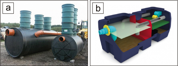 Fot. 5 Przykładowe separatory produktów ropopochodnych stosowane jako element oczyszczający wody opadowe odwodnienia wgłębnego obiektów mostowych: a) separatory wykonane w technologii tworzyw sztucznych, przygotowane do wbudowania; b) przekrój separatora przedstawiający ideę jego funkcjonowania [23]