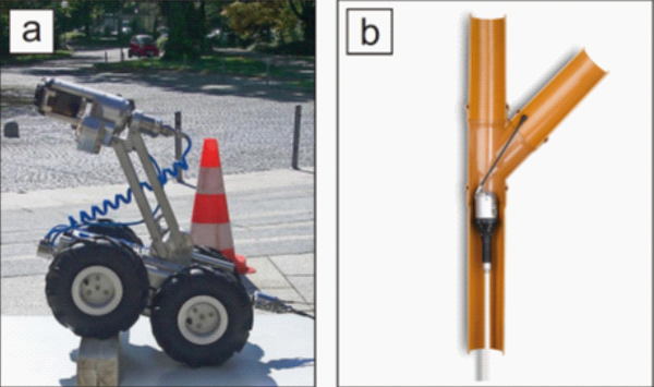 Fot. 6 Kamery inspekcyjne stosowane do przeglądów systemu odwodnienia wgłębnego obiektów mostowych: a) kamera montowana na podwoziu samojezdnym do inspekcji kolektorów dużych średnic, b) kamera z obrotową głowicą do inspekcji mniejszych średnic oraz przyłączy [24]