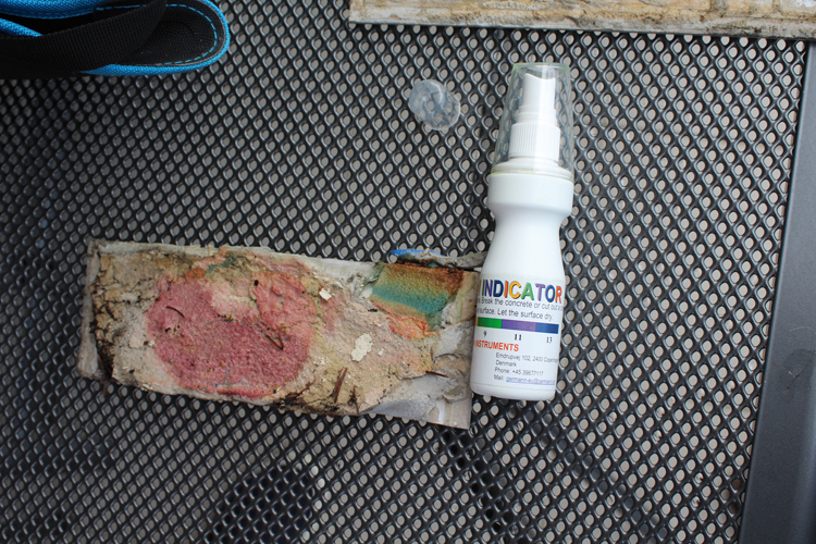 Fot. 9. Płytka zdjęta z pionowej części boku balkonu; zupełnie inna wartość pH wskazuje na znacznie mniejszą intensywność procesów destrukcyjnych (należy rozpatrywać łącznie z fot. 7 i 8, opis w tekście)