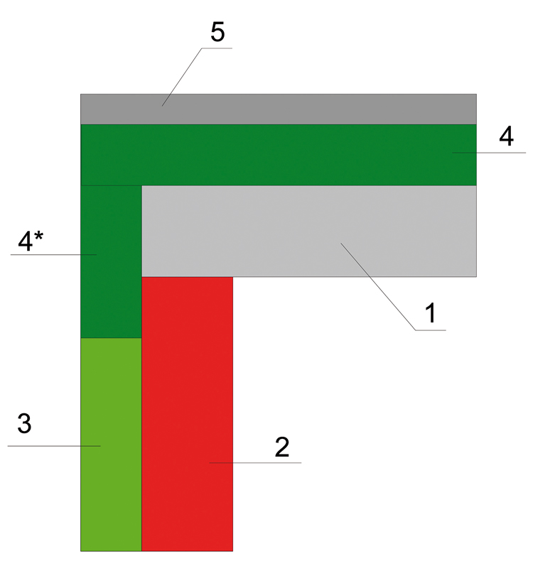 Rys. 2. Poprawny układ termoizolacji strefy okapu: 1 – strop, 2 – ściana, 3 – styropian fasadowy, 4, 4* – styropian klasy EPS 200 lub wyższej lub polistyren ekstrudowany (XPS), 5 – jastrych dociskowy (rys. autora)