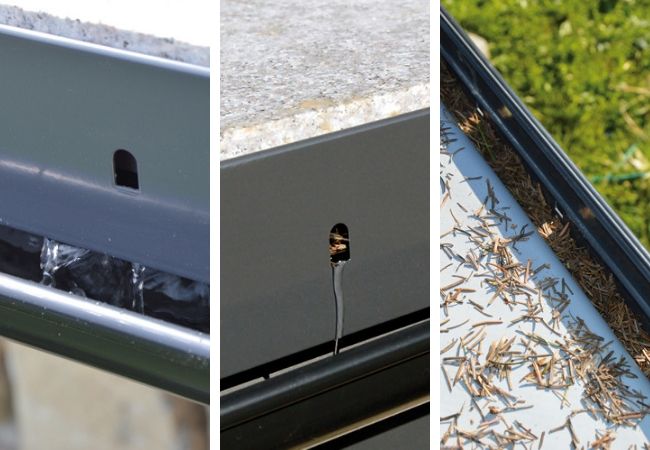 Fot. 12–14. Zanieczyszczenia mogą utrudniać usunięcie wody z połaci, dlatego profil okapowy powinien mieć „awaryjne odprowadzenie wody” (fot. Renoplast)