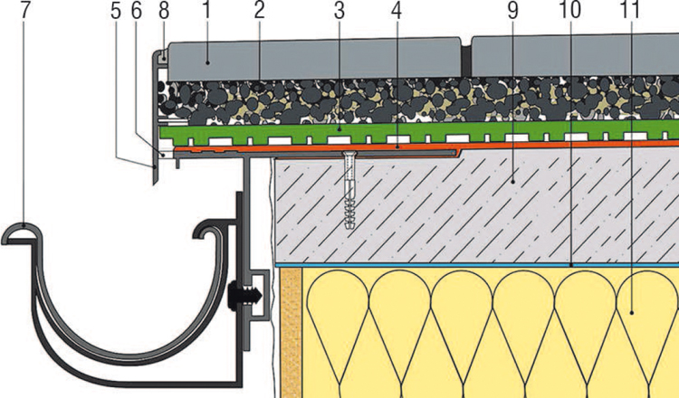 Rys. 4. Montaż i uszczelnienie prefabrykowanego profilu okapowego przeznaczonego dla balkonów/tarasów z drenażowym odprowadzeniem wody i warstwą użytkową z płyt ułożonych na kruszywie: 1 – płyty kamienne/betonowe, 2 – płukane, mrozoodporne kruszywo, 3 – mata drenażowa, 4 – powłoka wodochronna, 5 – systemowy profil okapowy, 6 – otwór odprowadzający wodę, 7 – rynna, 8 – elastyczna masa uszczelniająca, 9 – jastrych dociskowy, 10 – izolacja międzywarstwowa, 11 – termoizolacja Sposób obsadzenia i uszczelnienia profilu okapowego (5) zależy od rodzaju materiału wodochronnego (4). (rys. Renoplast)