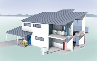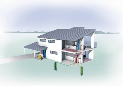 W przypadku zastosowania sond pionowych (rys. 3) rury wpuszczane są w głąb ziemi, najczęściej do ok. 100 m. Zwykle wystarcza wykonanie paru odwiertów oddalonych od siebie o kilka metrów. Zajęta jest niewielka powierzchnia działki, całą resztę można dowolnie zagospodarować. Projekt geologiczny i głębokie wiercenia zwiększają koszty, ale taki układ pompy ciepła charakteryzuje się stałą mocą i wysoką sprawnością przez cały sezon grzewczy.