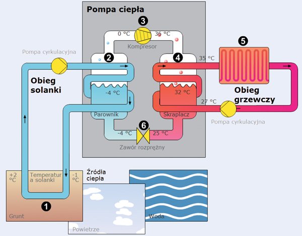 W układzie urządzenia krąży czynnik chłodniczy, który pobiera ciepło niskotemperaturowe w parowniku urządzenia (z powietrza, wody gruntu lub ciepła odpadowego itd.) i odparowuje w niskiej temperaturze i ciśnieniu. Pary czynnika zasysane są przez sprężarkę, która podnosi ich ciśnienie. Pary czynnika sprężone do wysokiego ciśnienia osiągają odpowiednio wysoką temperaturę, która pozwala podgrzać medium grzewcze przepływające przez skraplacz. Ciepło odbierane w skraplaczu powoduje, że czynnik się skrapla. Czynnik w formie ciekłej trafia do zaworu rozprężnego, w którym dławiony jest do niskiego ciśnienia i niskiej temperatury. Rozprężony płyn roboczy o niskiej temperaturze jest w stanie ponownie odparować w parowniku zasilanym niskotemperaturową energią odnawialną pozyskiwaną z dolnego źródła i cykl się powtarza.