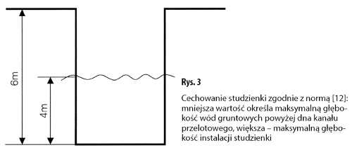 Zasadę cechowania pokazano na rys. 3. W przypadku jego braku i równoczesnej deklaracji producenta, że studzienka spełnia wymagania normy PN-EN 13598 [12], przyjmuje się, że maksymalna głębokość instalacji studzienki wynosi 6 m, natomiast maksymalna głębokość wód gruntowych powyżej dna kanału przelotowego studzienki jest równa 2 m. Od razu należy zaznaczyć, że wszystkie obecnie stosowane połączenia są wodoszczelne, a cechowanie określa maksymalne wzniesienie wody. Równocześnie nie oznacza to, że studzienka może być posadowiona bez dodatkowego obciążnika, gdyż jedynie wybrane konstrukcje tolerują posadowienie bez dodatkowego dociążenia. Zawsze w razie wątpliwości należy skonsultować się z odpowiednim doradcą technicznym względnie biurem konstrukcyjnym producenta.