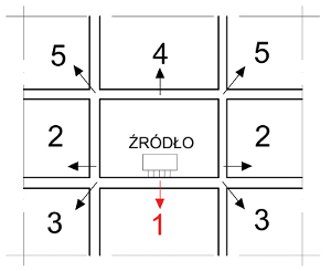 Kolejnym parametrem akustycznym charakteryzującym izolacyjność stro­pu jest poziom uderzeniowy, okre­ślany tylko dla tego typu przegrody. Zgodnie z normą [8] jest to poziom ciśnienia akustycznego w pomiesz­czeniu odbiorczym podczas pobudza­nia danego stropu znormalizowanym źródłem dźwięku uderzeniowego, czyli tzw. stukaczem. Dźwięki uderzenio­we rozprzestrzeniają się w budynku we wszystkich kierunkach (rys. 2), jednakże w większości występują­cych w praktyce przypadków dla da­nego budynku izolacyjność od dźwię­ków uderzeniowych w kierunku 1 jest mniejsza niż izolacyjność w pozosta­łych kierunkach. W takiej sytuacji wy­starczające jest określenie wymagań tylko dla kierunku 1. Jeżeli jednak nie stosuje się wymagań izolacyjności od dźwięków uderzeniowych w kierun­ku 1, może wystąpić potrzeba okre­ślenia odpowiednich wymagań w po­zostałych kierunkach.